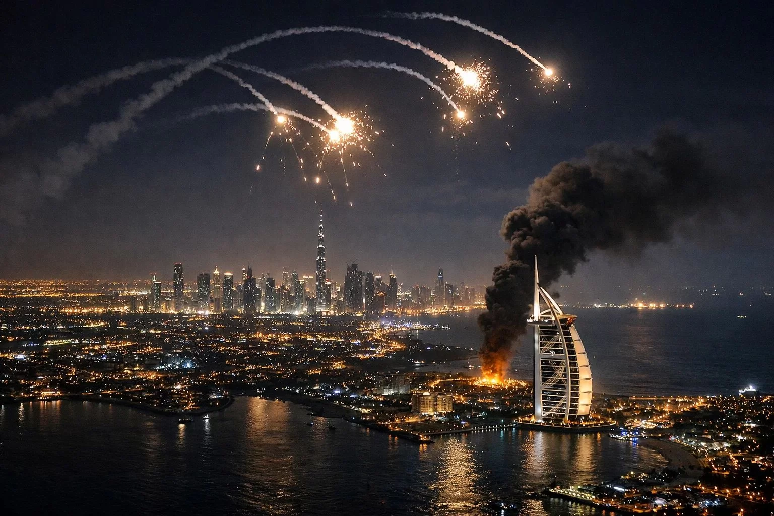 Одну из ракет сбили прямо над знаменитым отелем Atlantis The Royal на «Пальме Джумейре» — именно там в тот момент отдыхали российские туристы. Пожар вспыхнул на том же искусственном острове, рядом с пятизвёздочным Fairmont. Взрывы прогремели в элитном Dubai Marina. Пострадал крупнейший в регионе порт Джебель-Али. В Абу-Даби обломки перехваченной ракеты упали на жилой квартал — один человек погиб. Это была первая официально подтверждённая жертва среди мирного населения. По данным на 2 марта, в ОАЭ насчитывается уже трое погибших, около 60 получили ранения в результате атак со стороны Ирана.