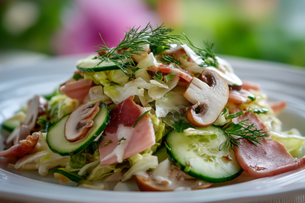 Для приготовления вам понадобится: кочан пекинской капусты, 200 г шампиньонов, 150 г сыра сулугуни, 2 свежих огурца, 200 г ветчины, майонез и соль по вкусу. Капусту мелко нашинкуйте, огурцы и ветчину нарежьте тонкой соломкой. Шампиньоны нарежьте слайсами и обжарьте на масле до готовности. Сыр натрите на крупной терке. Смешайте все ингредиенты в глубокой миске, заправьте майонезом, посолите по вкусу. Дайте настояться 15 минут — и можно подавать. Этот салат впечатляет сочетанием ингредиентов, и вам точно захочется добавки.