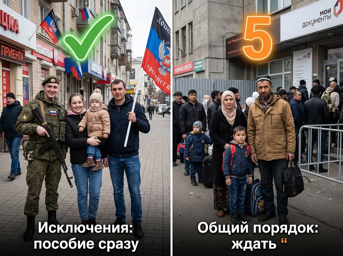 Механика проста. Раньше любой гражданин РФ с низким доходом и детьми мог подать заявление на пособие — без оговорок о том, когда именно он стал гражданином. Теперь в правилах появилось дополнительное условие: непрерывное проживание в России в статусе гражданина не менее пяти лет. Получил паспорт год назад — жди ещё четыре. Получил три года назад — жди ещё два. Отсчёт идёт строго от даты вступления в гражданство.